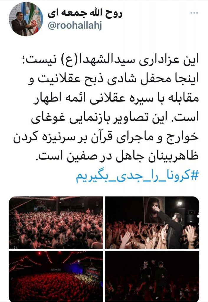 روح الله جمعه‌ای مشاور وزیر کشور در واکنش به انتشار تصاویر عزاداری محرم و عدم رعایت پروتکل‌های بهداشتی نوشت: این تصاویر بازنمایی غوغای خوارج و ماجرای قرآن بر سرنیزه کردن ظاهربینان جاهل در صفین است.