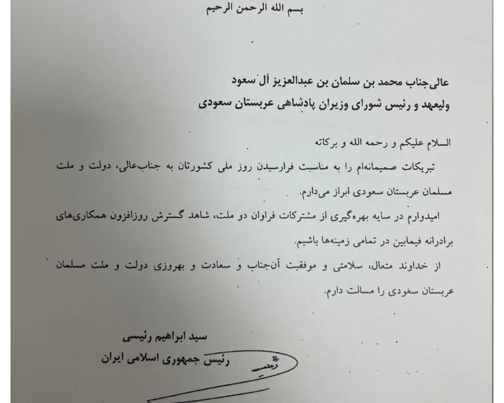به گزارش خبرگزاری خبرشهر، سفارت ایران در ریاض در این ارتباط در صفحه توییتر خود نوشت: «جناب آیت الله دکتر سید ابراهیم رئیسی، رییس محترم جمهوری اسلامی ایران، در پیام‌هایی، روز ملی عربستان سعودی را به عالی جناب ملک سلمان بن عبدالعزیز ال سعود، پادشاه عربستان سعودی و عالی جناب امیر محمد بن سلمان بن عبدالعزیز، ولیعهد و رییس شورای وزیران پادشاهی عربستان سعودی تبریک گفتند.»